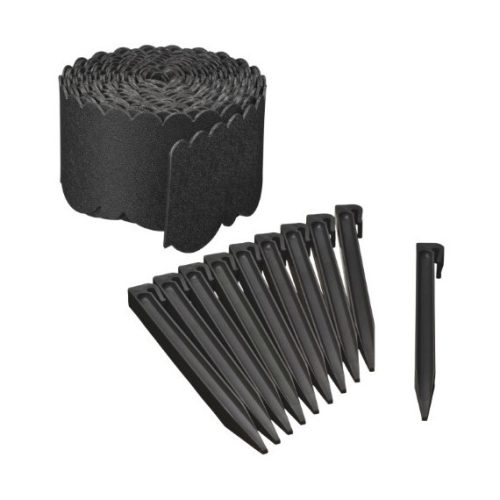 Ágyásszegély szett hullámos felső rész, 3 mm, fekete, 13cmx12m + leszúró tüske, fekete, 26,7x1,9x1,8cm, 10db