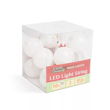 Vidám, hóemberes fényfüzér, amely azonnal jókedvre deríti a családot. Az átlátszó kis hóember fejeket melegfehér LED-ek világítják meg, így otthonában minden irányból csodálatos vizuális élményt nyújt. Ideális lehet karácsonyfák, girlandok, polcok, koszorúk, függönyök díszítésére. A LED fényforrás alacsony energiafelhasználása miatt, elemmel is sokáig üzemeltethető.