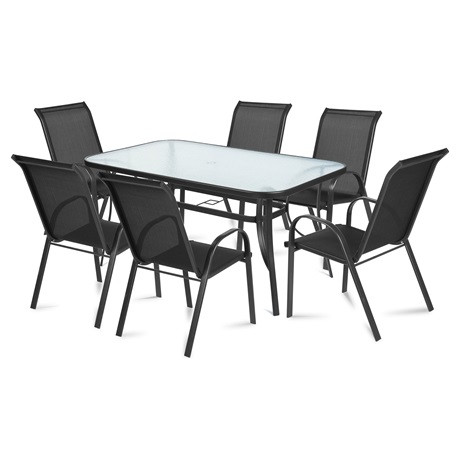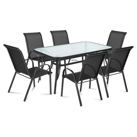 A Fieldmann RONY I. kerti bútor szett elegáns és időtlen. Tökéletes választás kertekbe vagy teraszokra. A szett tartalma egy kerti fémvázas asztal keményített, edzett üveglappal, átlátszó színű kivitelben és 6 db fémvázas szék, szintetikus szövettel borítva. Az acélból készült váznak köszönhetően nem jelent nagy feladatot a por és egyéb szennyeződések eltávolítása alacsony víznyomás mellett vagy enyhe tisztítószeres vízzel.