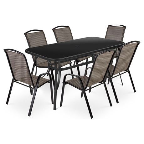 A Fieldmann RONY II. DARK kerti bútor szett elegáns és időtlen. Tökéletes választás kertekbe vagy teraszokra. A szett tartalma egy kerti fémvázas asztal keményített, edzett üveglappal, fekete színű kivitelben és 6 db fémvázas szék, szintetikus szövettel borítva. Az acélból készült váznak köszönhetően nem jelent nagy feladatot a por és egyéb szennyeződések eltávolítása alacsony víznyomás mellett vagy enyhe tisztítószeres vízzel.