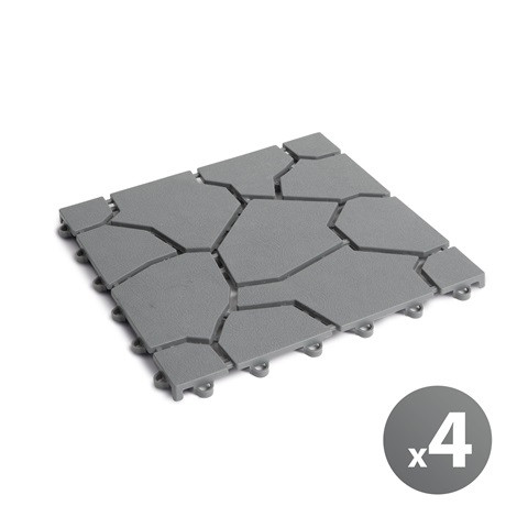 Strapabíró műanyagból készült kőhatású kerti padlólap, amely ideális lehet teraszok, grillhelyek, kerti ösvények, verandák burkolására. A kőhatású design jól illeszkedik bármelyik kertbe, természetbe. Időjárásálló anyagának köszönhetően az év bármely napján használhatja, nem szükséges felszedni rosszidő esetén. A felületén lévő lyukak lehetővé teszik, hogy a víz át tudjon rajta folyni, így nem alakulnak ki pocsolyák. A klikkes rendszernek köszönhetően könnyen és gyorsan egymáshoz kapcsolhatóak az elemek, így lerakása egyszerűen megoldható.