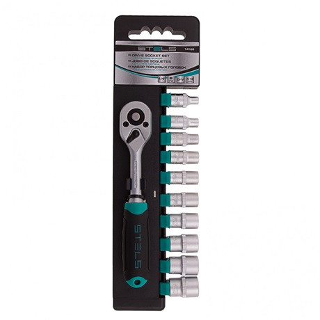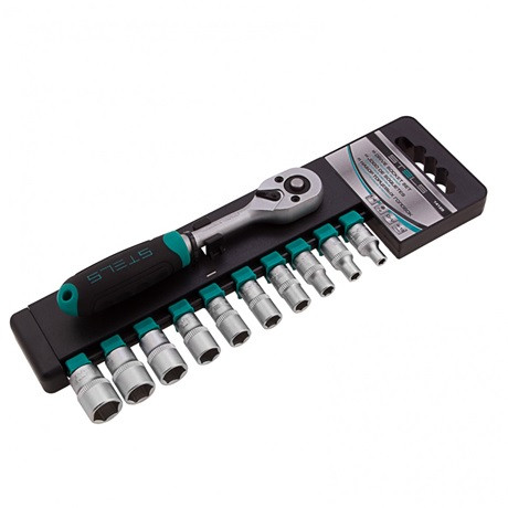 A Gross 14141 racsnis készlet 12 darab 1/4"-es befogású CrV dugókulcs fejet tartalmaz: 10 foglalatot, egy 120 fogú racsnit és egy 100 mm-es hosszabbítót.