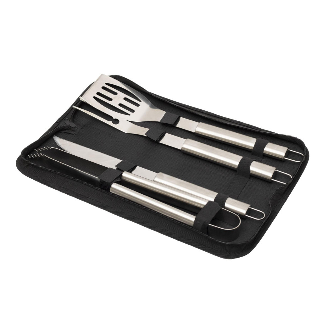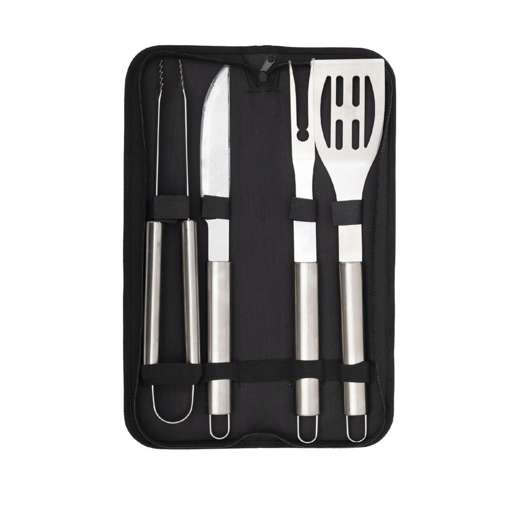 A készlet négy, gondosan megtervezett eszközt tartalmaz: egy grillcsipeszt, egy éles BBQ kést, egy masszív húsvillát és egy húsforgató lapátot. Az eszközök felületkezelt fémből készültek, amely nemcsak ellenállóvá teszi őket a hővel és nedvességgel szemben, de könnyen tisztíthatók is. A szett összsúlya mindössze 990 g, így könnyen hordozható, mégis stabil és tartós.