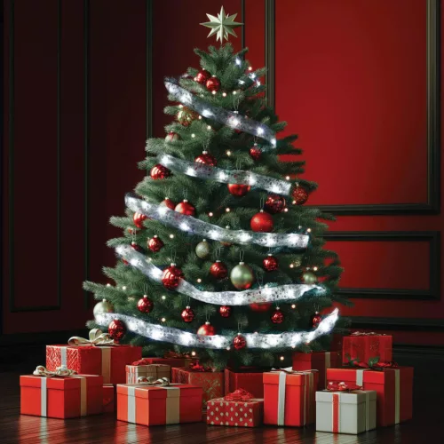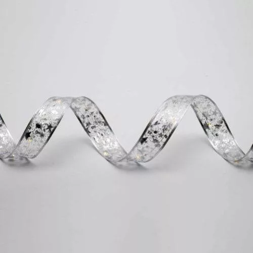 A hidegfehér fény és a szalag ezüst tónusa elegáns megjelenést kölcsönöz, amely kiválóan illik modern és klasszikus enteriőrbe egyaránt. A szalag kialakítása nem csupán dekoratív, de könnyen formázható is, így kreatívan használható az ünnepi díszítés során.