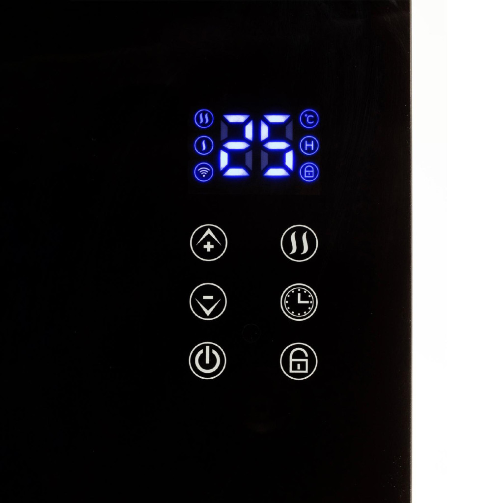 Ez a stílusos fekete készülék edzett üveg előlappal rendelkezik, amely nemcsak elegáns megjelenést kölcsönöz, hanem tartósságot is biztosít. Két fűtési fokozata van: 1000 W és 2000 W, így bármikor az igényeinek megfelelően szabályozhatja a hőmérsékletet. A készülék érintőgombokkal és okostelefonos alkalmazással is vezérelhető, így akár távolról is kényelmesen irányíthatja a fűtést. Az elektronikus termosztát segítségével pontosan beállíthatja a kívánt hőmérsékletet, míg a kikapcsolásidőzítés funkcióval előre meghatározhatja a fűtés időtartamát. Az IPX4 védelem biztosítja, hogy a készülék fröccsenő víz ellen is védett legyen, így akár fürdőszobában is használható.