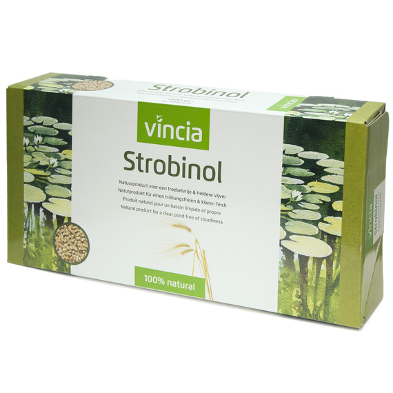 A Strobinol egy árpaszalmán alapuló természetes termék, amely megelőző hatású: a tó vize tiszta és zavarmentes marad. Az árpaszalma 100%-ban természetes hatása az amőbák és más planktonok fejlődésén alapul: a mikroszkopikus állatok hosszú ideig tisztán tartják a tavat. Az árpaszalma lebomlása során hasznos anyagokat bocsát ki a tóba. A Strobinol koncentrált árpaszalma felhasználóbarát pellet formájában. 100%-ban természetes szerves összetevőket tartalmaz, és biológiailag lebomló.